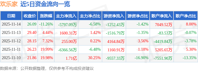 证券之星消息,截至2025年11月14日收盘,欢乐家(300997)报收于26.09元,下跌11.26%,换手率8.45%,成交量32.61万手,成交额8.82亿元。