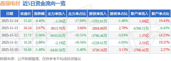 11月14日的资金流向数据方面,主力资金净流出1.56亿元,占总成交额17.94%,游资资金净流出1293.81万元,占总成交额1.48%,散户资金净流入1.69亿元,占总成交额19.43%。
