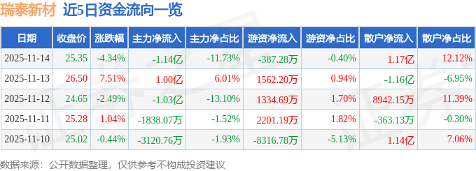 证券之星消息,截至2025年11月14日收盘,瑞泰新材(301238)报收于25.35元,下跌4.34%,换手率5.17%,成交量37.89万手,成交额9.68亿元。