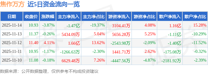 证券之星消息,截至2025年11月14日收盘,焦作万方(000612)报收于10.93元,下跌3.87%,换手率5.75%,成交量68.55万手,成交额7.6亿元。