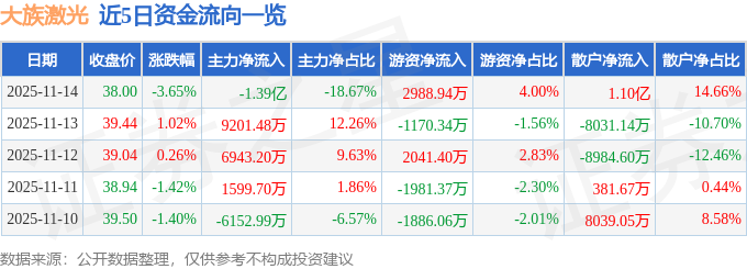 证券之星消息,截至2025年11月14日收盘,大族激光(002008)报收于38.0元,下跌3.65%,换手率2.03%,成交量19.41万手,成交额7.47亿元。
