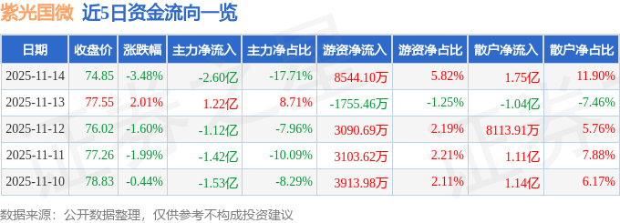 证券之星消息,截至2025年11月14日收盘,紫光国微(002049)报收于74.85元,下跌3.48%,换手率2.29%,成交量19.42万手,成交额14.69亿元。