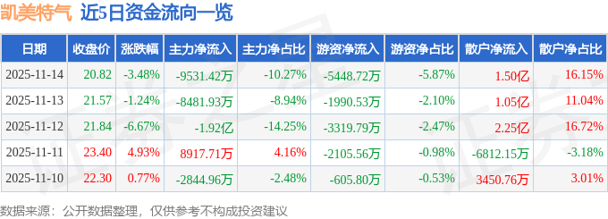 证券之星消息,截至2025年11月14日收盘,凯美特气(002549)报收于20.82元,下跌3.48%,换手率6.35%,成交量43.97万手,成交额9.28亿元。