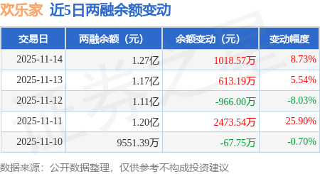 证券之星消息,11月14日,欢乐家(300997)融资买入8799.4万元,融资偿还7780.83万元,融资净买入1018.57万元,融资余额1.27亿元。