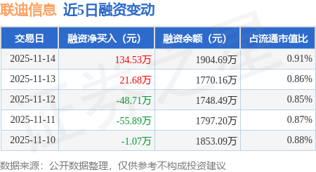 证券之星消息,11月14日,联迪信息(920790)融资买入313.71万元,融资偿还179.18万元,融资净买入134.53万元,融资余额1904.69万元。
