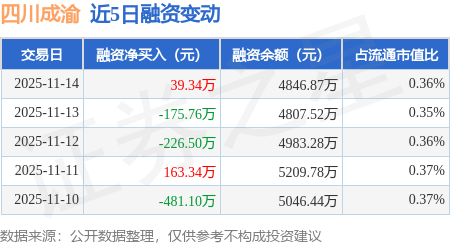 证券之星消息,11月14日,四川成渝(601107)融资买入401.47万元,融资偿还362.12万元,融资净买入39.34万元,融资余额4846.87万元。