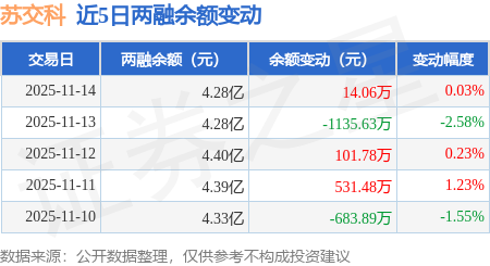 证券之星消息,11月14日,苏交科(300284)融资买入1250.11万元,融资偿还1251.75万元,融资净卖出1.64万元,融资余额4.27亿元。