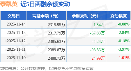 证券之星消息,11月14日,泰凯英(920020)融资买入172.23万元,融资偿还174.07万元,融资净卖出1.84万元,融资余额2315.95万元。
