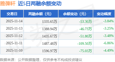 证券之星消息,11月14日,雅葆轩(920357)融资买入146.22万元,融资偿还199.52万元,融资净卖出53.3万元,融资余额1335.65万元。