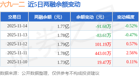 证券之星消息,11月14日,六九一二(301592)融资买入586.37万元,融资偿还675.43万元,融资净卖出89.05万元,融资余额1.77亿元。