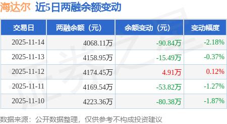 证券之星消息,11月14日,海达尔(920699)融资买入249.29万元,融资偿还340.13万元,融资净卖出90.84万元,融资余额4068.11万元。