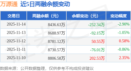 证券之星消息,11月14日,万源通(920060)融资买入403.27万元,融资偿还655.61万元,融资净卖出252.34万元,融资余额8436.63万元。