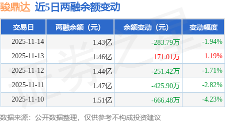 证券之星消息,11月14日,骏鼎达(301538)融资买入502.19万元,融资偿还785.98万元,融资净卖出283.79万元,融资余额1.43亿元。