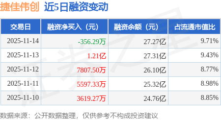 证券之星消息,11月14日,捷佳伟创(300724)融资买入3.39亿元,融资偿还3.42亿元,融资净卖出356.29万元,融资余额27.27亿元。