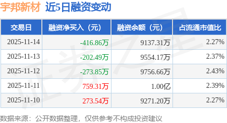 证券之星消息,11月14日,宇邦新材(301266)融资买入530.88万元,融资偿还947.74万元,融资净卖出416.86万元,融资余额9137.31万元。