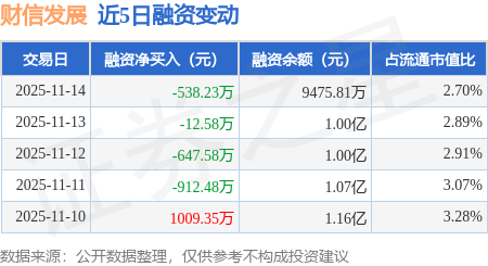 证券之星消息,11月14日,财信发展(000838)融资买入708.32万元,融资偿还1246.55万元,融资净卖出538.23万元,融资余额9475.81万元。