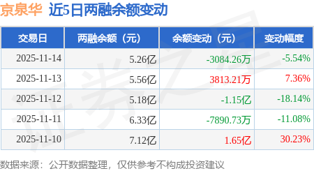 证券之星消息,11月14日,京泉华(002885)融资买入1.14亿元,融资偿还1.45亿元,融资净卖出3083.96万元,融资余额5.26亿元,近20个交易日中有11个交易日出现融资净买入。