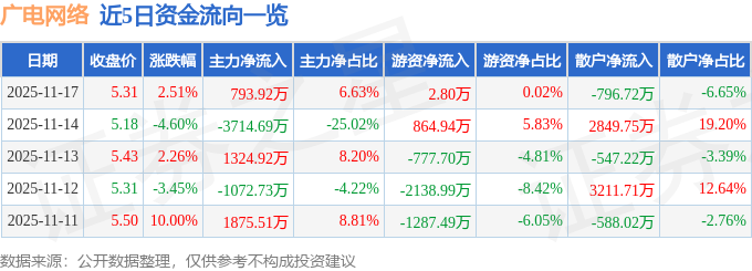 证券之星消息,截至2025年11月17日收盘,广电网络(600831)报收于5.31元,上涨2.51%,换手率3.2%,成交量22.75万手,成交额1.2亿元。