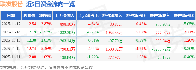 证券之星消息,截至2025年11月17日收盘,联发股份(002394)报收于12.54元,上涨2.87%,换手率4.84%,成交量15.66万手,成交额1.94亿元。