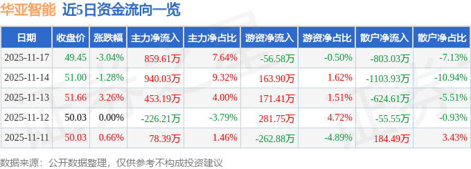 证券之星消息,截至2025年11月17日收盘,华亚智能(003043)报收于49.45元,下跌3.04%,换手率2.7%,成交量2.26万手,成交额1.13亿元。