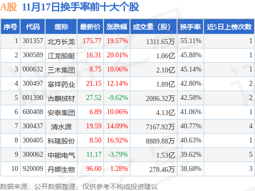 当日A股换手率前10大个股中8只个股收涨,平均涨幅13.02%,其中北方长龙(301357)以换手率55.11%排第一,5只个股近5个交易日中多次上榜。