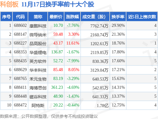 当日科创板换手率前10大个股中3只个股收涨,平均涨幅7.65%,其中康鹏科技(688602)以换手率29.9%排第一,9只个股近5个交易日中多次上榜。