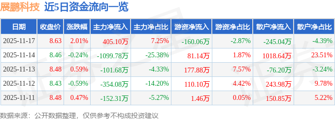 证券之星消息,截至2025年11月17日收盘,展鹏科技(603488)报收于8.63元,上涨2.01%,换手率2.22%,成交量6.49万手,成交额5583.88万元。