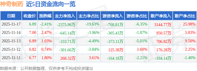 证券之星消息,截至2025年11月17日收盘,神奇制药(600613)报收于6.89元,下跌2.41%,换手率3.65%,成交量17.5万手,成交额1.21亿元。