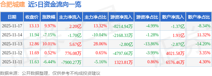 证券之星消息,截至2025年11月17日收盘,合肥城建(002208)报收于13.13元,上涨9.97%,涨停,换手率16.48%,成交量132.35万手,成交额16.48亿元。