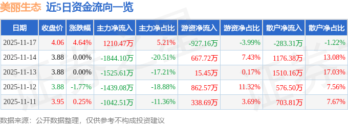 证券之星消息,截至2025年11月17日收盘,美丽生态(000010)报收于4.06元,上涨4.64%,换手率6.99%,成交量58.06万手,成交额2.32亿元。