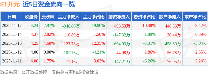证券之星消息,截至2025年11月17日收盘,ST开元(300338)报收于4.24元,下跌2.97%,换手率3.19%,成交量11.14万手,成交额4758.85万元。