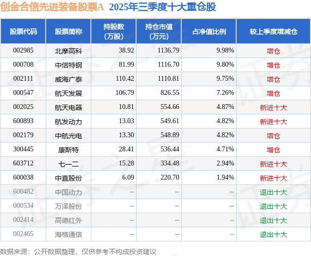 根据2025基金Q3季报公募基金重仓股数据,重仓该股的公募基金共1家,其中持有数量最多的公募基金为创金合信基金的创金合信先进装备股票A。创金合信先进装备股票A目前规模为0.38亿元,最新净值1.3824(11月14日),较上一交易日上涨0.52%,近一年上涨22.51%。该公募基金现任基金经理为李晗。