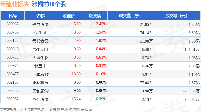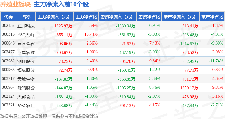 从资金流向上来看,当日养殖业板块主力资金净流出5.34亿元,游资资金净流入2.36亿元,散户资金净流入2.97亿元。养殖业板块个股资金流向见下表: