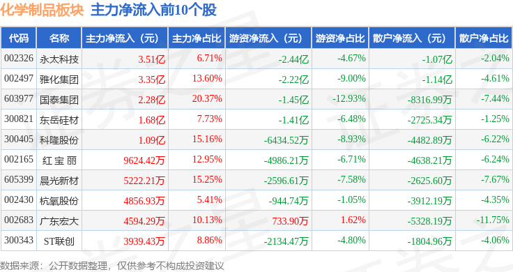 从资金流向上来看,当日化学制品板块主力资金净流入6438.29万元,游资资金净流出9.96亿元,散户资金净流入9.32亿元。化学制品板块个股资金流向见下表: