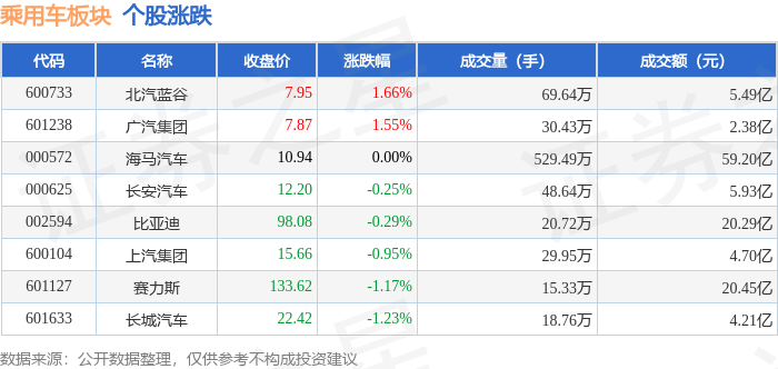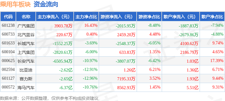 从资金流向上来看,当日乘用车板块主力资金净流出12.32亿元,游资资金净流入2.31亿元,散户资金净流入10.01亿元。乘用车板块个股资金流向见下表: