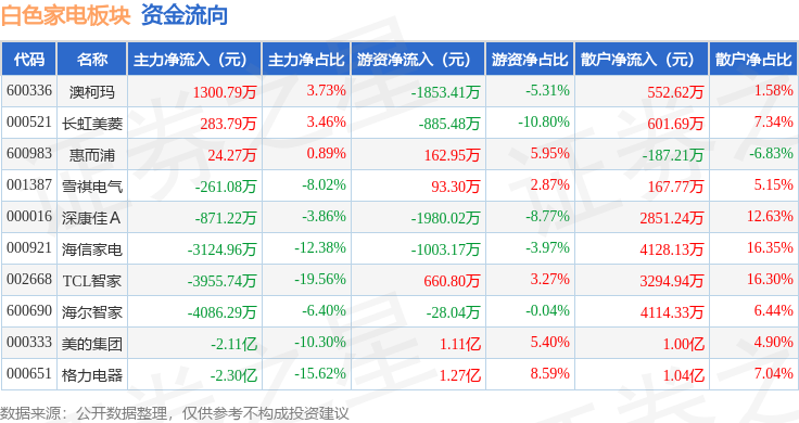 从资金流向上来看,当日白色家电板块主力资金净流出5.49亿元,游资资金净流入1.89亿元,散户资金净流入3.6亿元。白色家电板块个股资金流向见下表:
