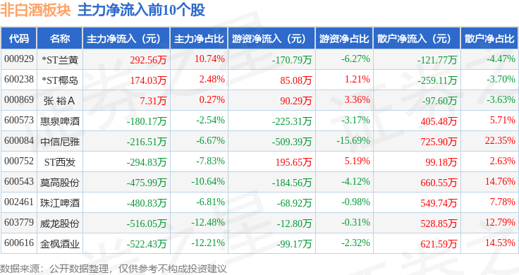 从资金流向上来看,当日非白酒板块主力资金净流出1.55亿元,游资资金净流出745.75万元,散户资金净流入1.63亿元。非白酒板块个股资金流向见下表: