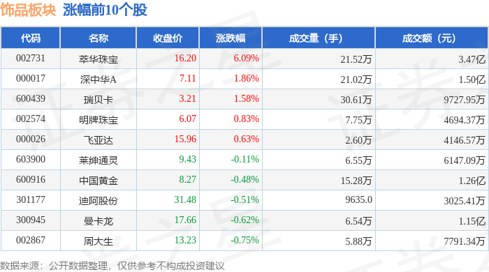 证券之星消息,11月17日饰品板块较上一交易日下跌0.55%,ST新华锦领跌。当日上证指数报收于3972.03,下跌0.46%。深证成指报收于13202.0,下跌0.11%。饰品板块个股涨跌见下表: