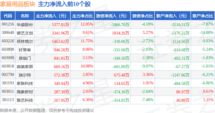 从资金流向上来看,当日家居用品板块主力资金净流出3.12亿元,游资资金净流入6650.42万元,散户资金净流入2.45亿元。家居用品板块个股资金流向见下表: