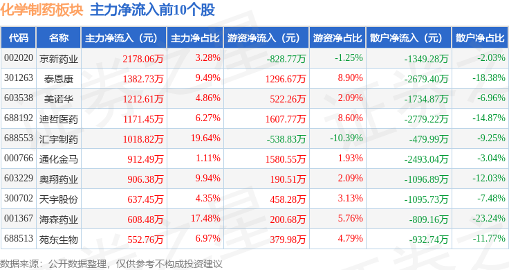 从资金流向上来看,当日化学制药板块主力资金净流出37.2亿元,游资资金净流入11.16亿元,散户资金净流入26.04亿元。化学制药板块个股资金流向见下表: