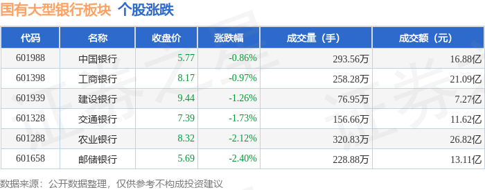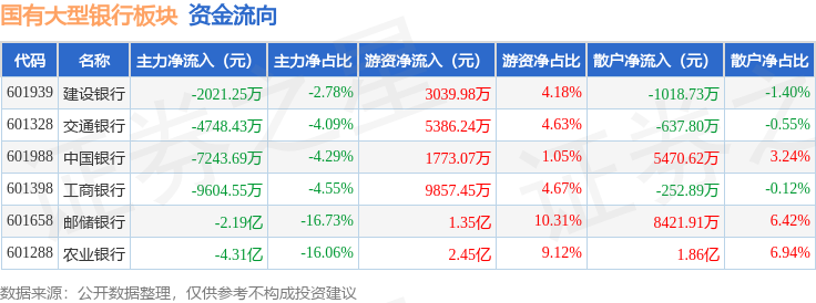 从资金流向上来看,当日国有大型银行板块主力资金净流出8.86亿元,游资资金净流入5.8亿元,散户资金净流入3.06亿元。国有大型银行板块个股资金流向见下表:
