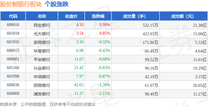 证券之星消息,11月17日股份制银行板块较上一交易日下跌0.97%,浦发银行领跌。当日上证指数报收于3972.03,下跌0.46%。深证成指报收于13202.0,下跌0.11%。股份制银行板块个股涨跌见下表: