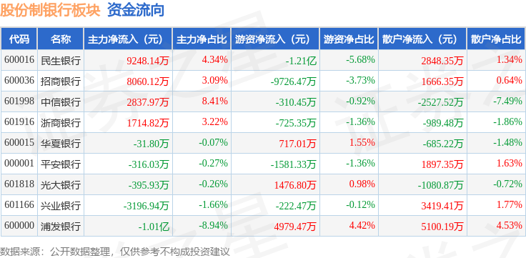 从资金流向上来看,当日股份制银行板块主力资金净流入7840.71万元,游资资金净流出1.75亿元,散户资金净流入9648.56万元。股份制银行板块个股资金流向见下表:
