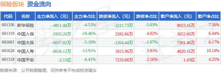 从资金流向上来看,当日保险板块主力资金净流出4.49亿元,游资资金净流入6856.14万元,散户资金净流入3.81亿元。保险板块个股资金流向见下表: