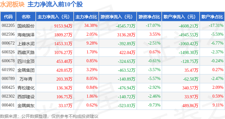 从资金流向上来看,当日水泥板块主力资金净流入6315.12万元,游资资金净流出5257.66万元,散户资金净流出1057.46万元。水泥板块个股资金流向见下表: