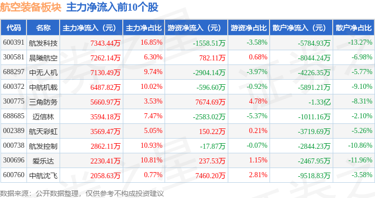 从资金流向上来看,当日航空装备板块主力资金净流入4.42亿元,游资资金净流入1.93亿元,散户资金净流出6.35亿元。航空装备板块个股资金流向见下表: