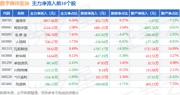 从资金流向上来看,当日数字媒体板块主力资金净流入5972.61万元,游资资金净流入632.39万元,散户资金净流出6605.0万元。数字媒体板块个股资金流向见下表: