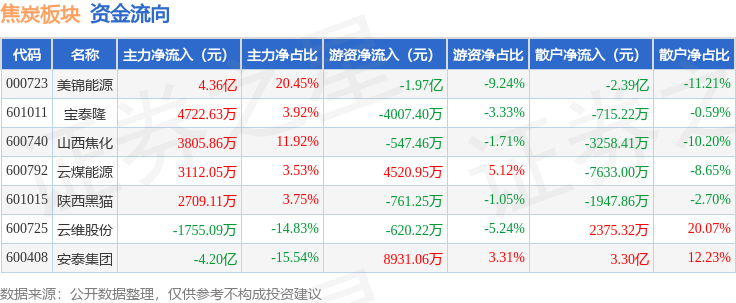 从资金流向上来看,当日焦炭板块主力资金净流入1.42亿元,游资资金净流出1.22亿元,散户资金净流出2034.03万元。焦炭板块个股资金流向见下表: