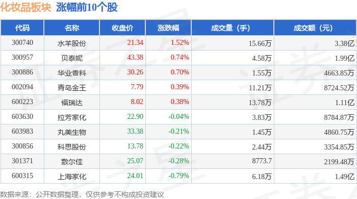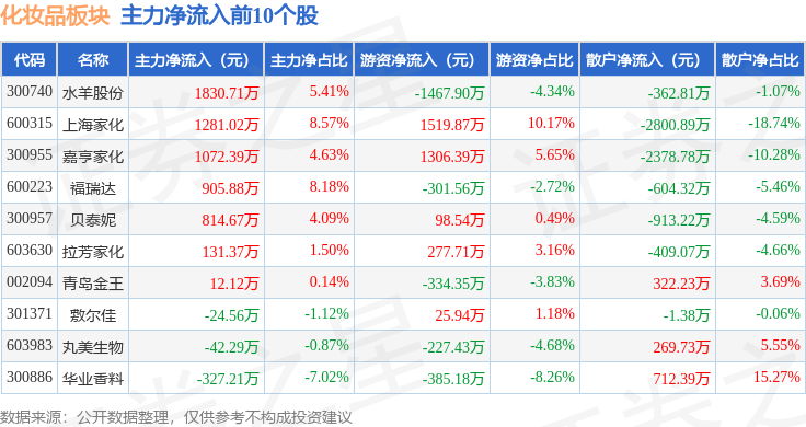 从资金流向上来看,当日化妆品板块主力资金净流出3441.45万元,游资资金净流入2740.43万元,散户资金净流入701.03万元。化妆品板块个股资金流向见下表: