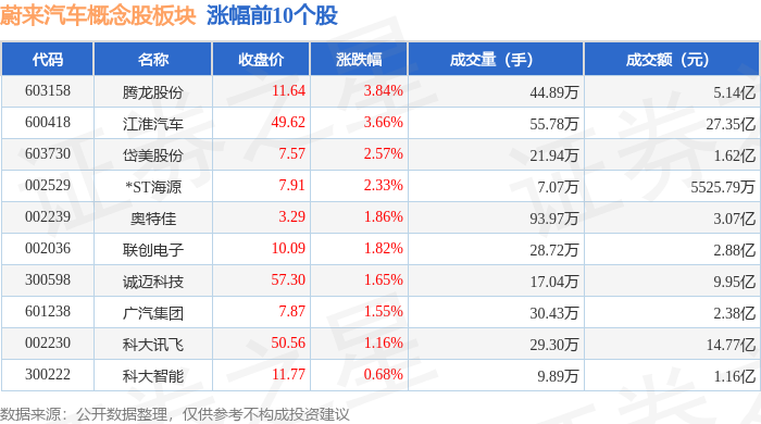 从资金流向上来看,当日蔚来汽车概念股板块主力资金净流出9.5亿元,游资资金净流入1.5亿元,散户资金净流入8.0亿元。蔚来汽车概念股板块个股资金流向见下表: